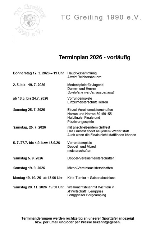 Untenstehend der Terminplan für die Saison 2026.